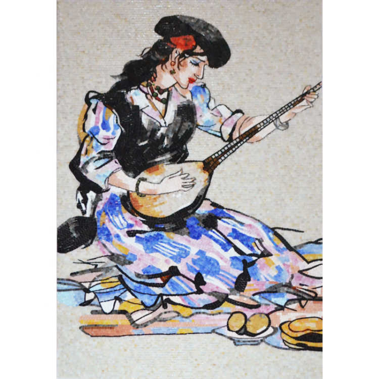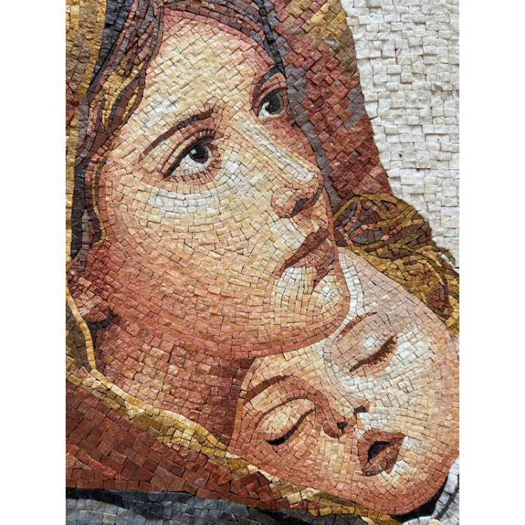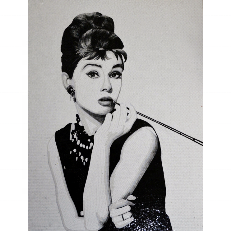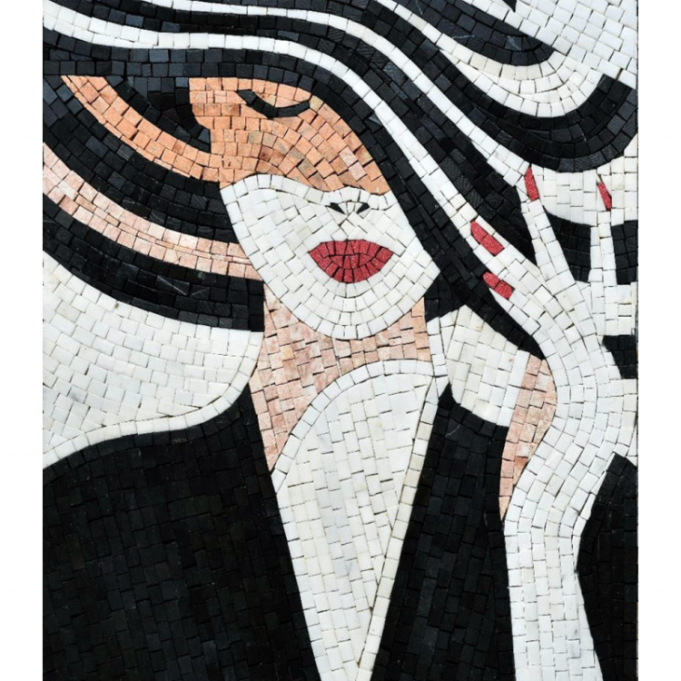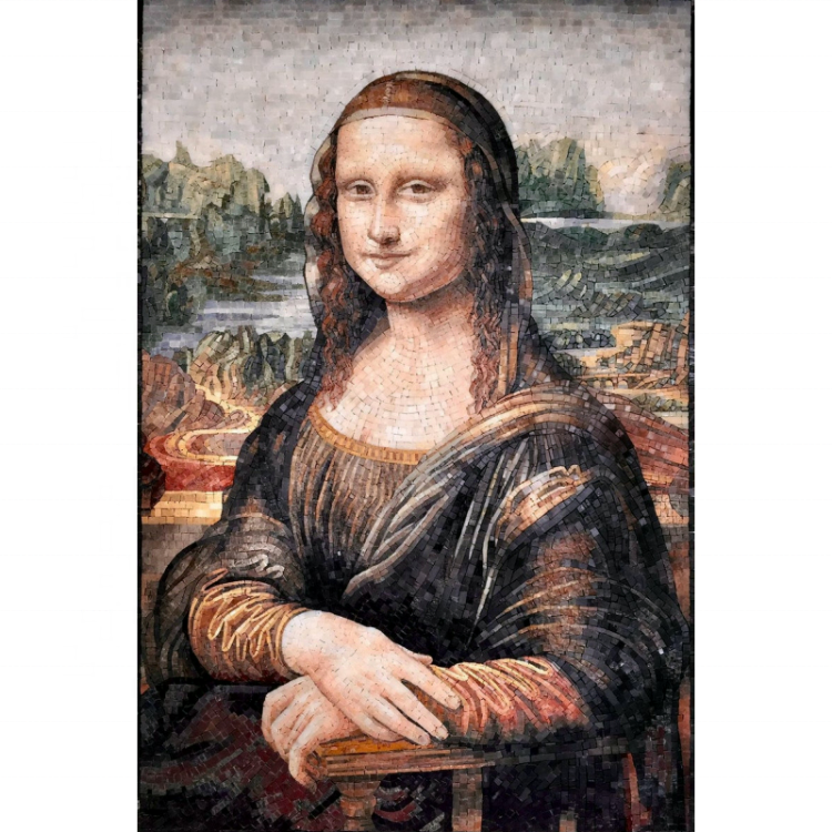 Design Europeo Contemporaneo, Parquet in Marmo Naturale, Mosaico Artistico, Ritratto con Sorriso Enigmatico, Design Grafico per Hotel Commerciali