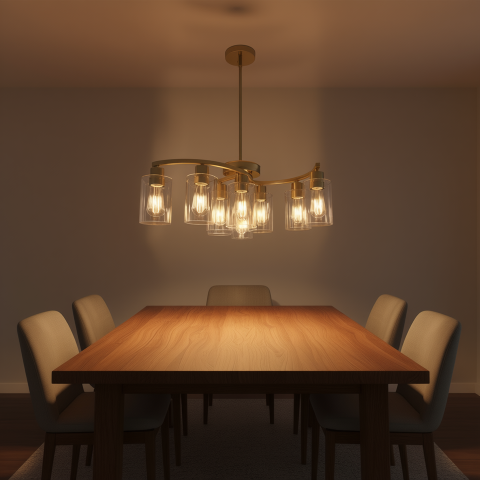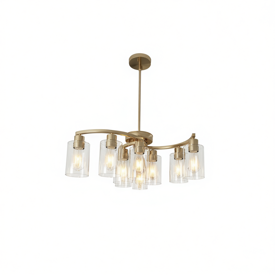 Lampadario Contemporaneo in Vetro Dorato a 9 Luci, Altezza Regolabile per Sala da Pranzo e Isola Cucina, Paralume Cilindrico Trasparente, LED E26