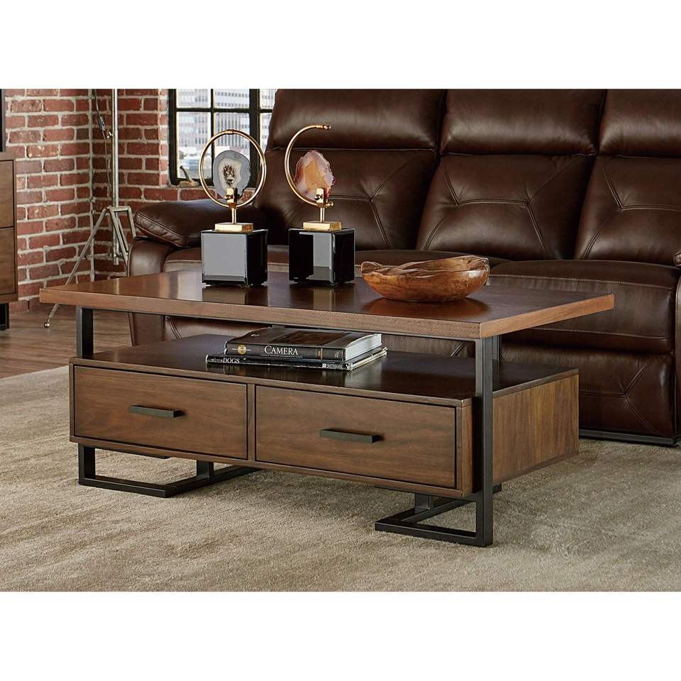 Tavolino da Caffè Contemporaneo in Metallo Nero con Finitura Rustica, Struttura Unica in Legno di Noce e 1 Cassetto, Accessorio per Soggiorno