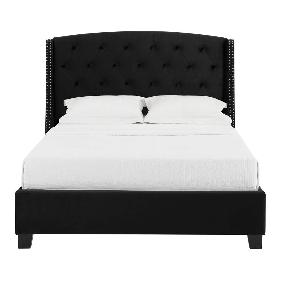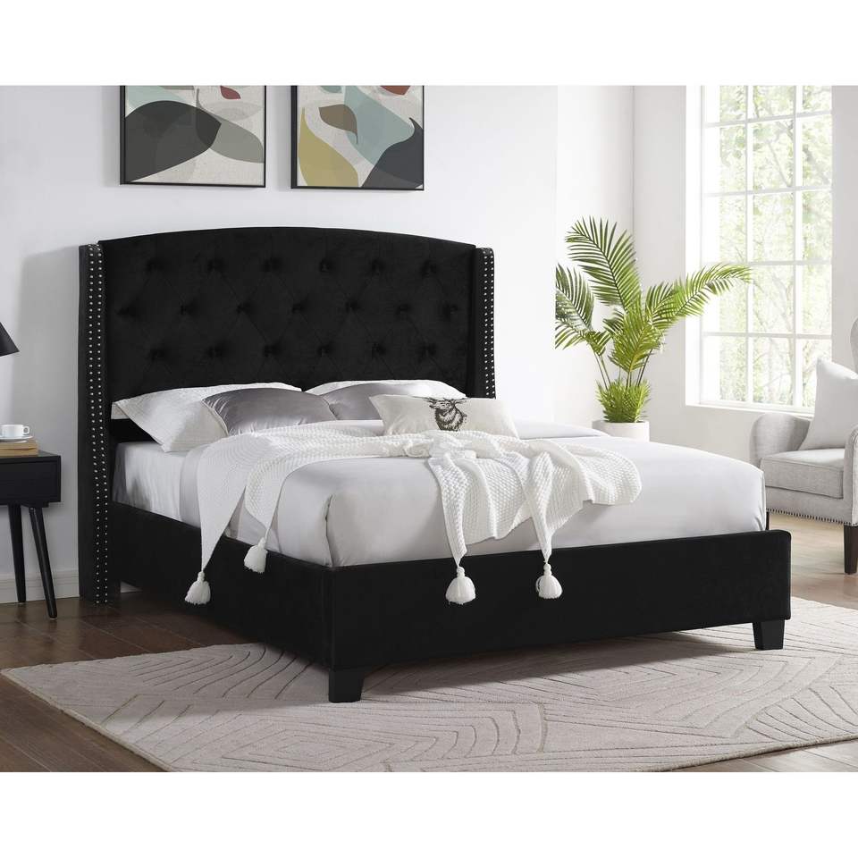 Letto Imbottito in Stile Contemporaneo con Finitura Nera, Struttura in Legno e Dettagli in Tessuto e Borchie, Arredamento Camera da Letto