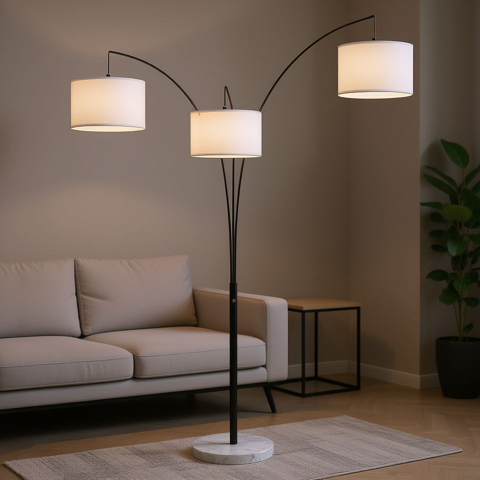 Lampada da Terra Contemporanea Trilage Arc con 3 Paralumi a Tamburo, Palo in Acciaio e Base in Marmo, Bianco e Nero, per Soggiorno e Camera da Letto