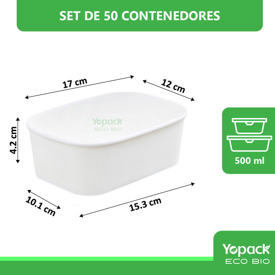 Contenedor rettangolare blanco Kraft de 500 ml, ecologico y practico para alimentos, paquete de 300 unidades, Envios desde Mexico