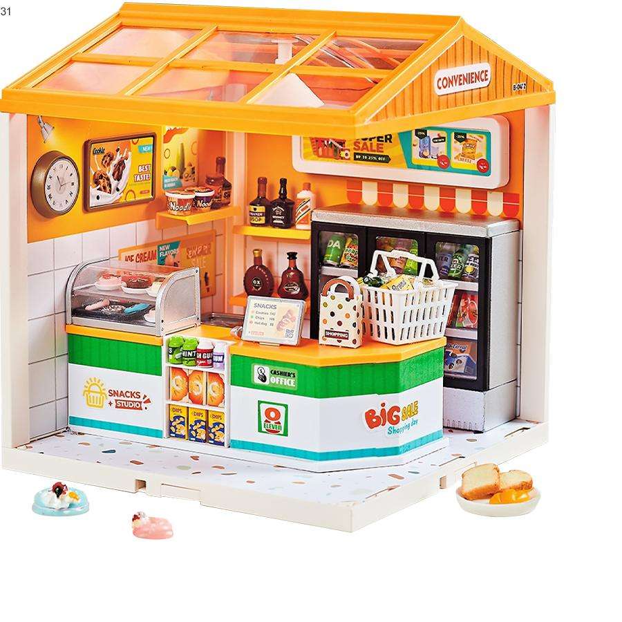 Minimarket giocattoli di simulazione educativa assemblaggio di negozi di città modello di illuminazione giocattoli per bambini blocco di costruzione