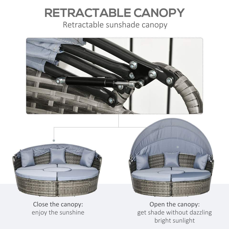 Set di Mobili da Giardino in Rattan Convertibile 4 Pezzi con Tettoia Regolabile, Divano Sezionale e 2 Sedie, Tavolo per Lettino/Sdraio e Riparo dal Sole