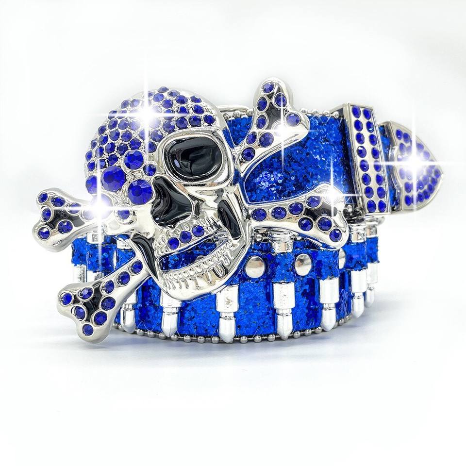 Cintura Unisex con Fibbia a Teschio Incastonata di Strass, Design Accattivante con Cinturino Glitterato Nero e Argento