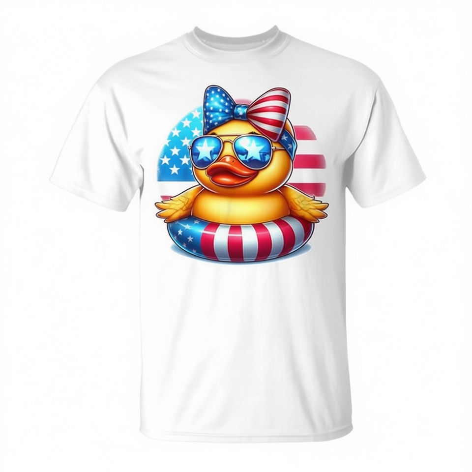 T-shirt patriottica del 4 luglio con bandiera degli Stati Uniti, simpatico Paperino in gomma