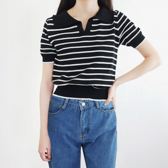 Cool Summer Women's Short Sleeve Knit Crop Top with Striped Knit Collar Chic Crop Knit Tee