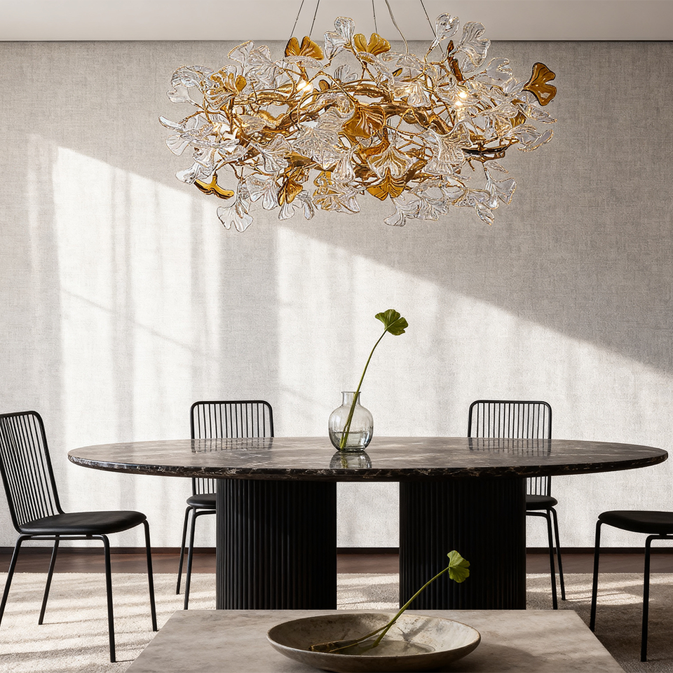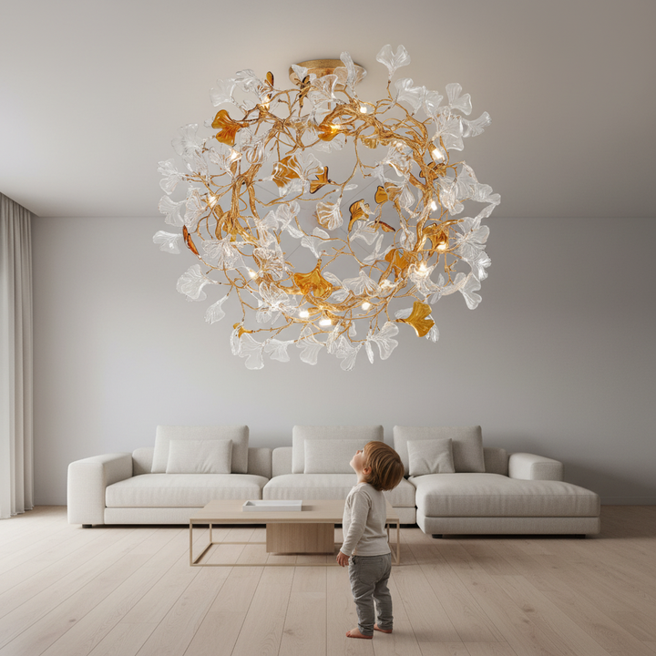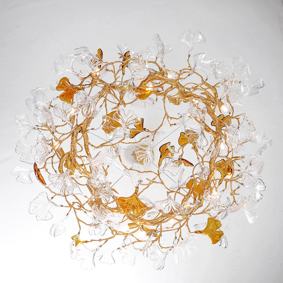 Lampadario in Rame con Decorazioni in Vetro a Forma di Foglia, Illuminazione Moderna di Alta Gamma Personalizzata per Soggiorno, Sala da Pranzo e Camera da Letto