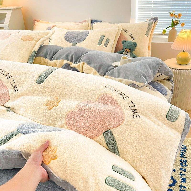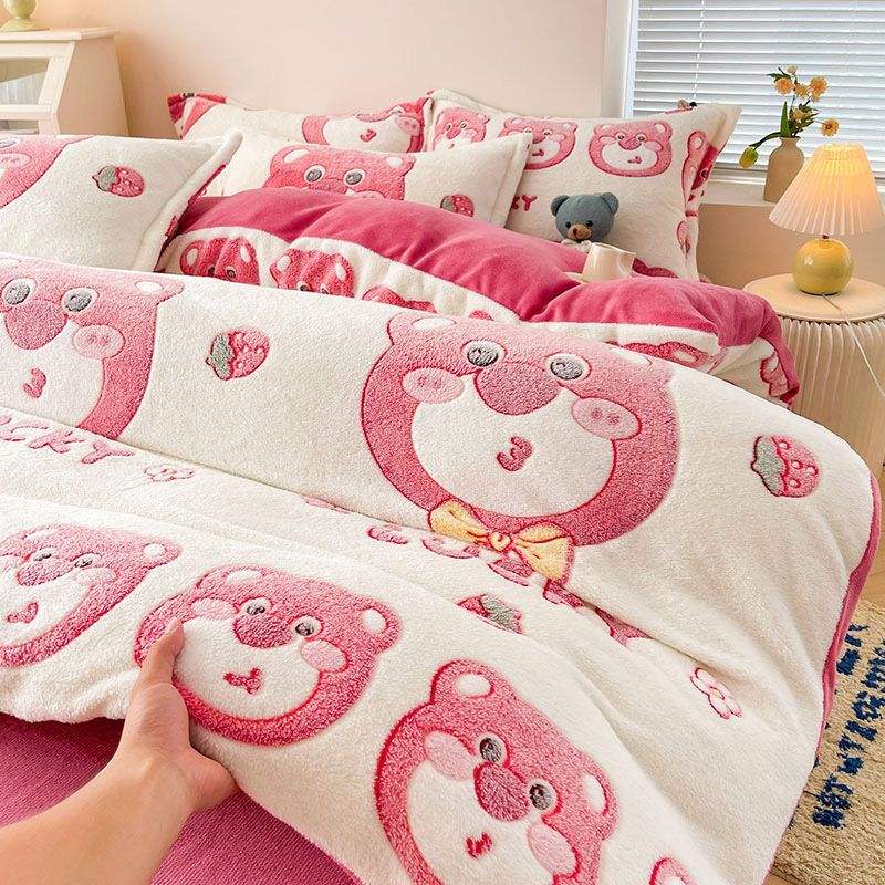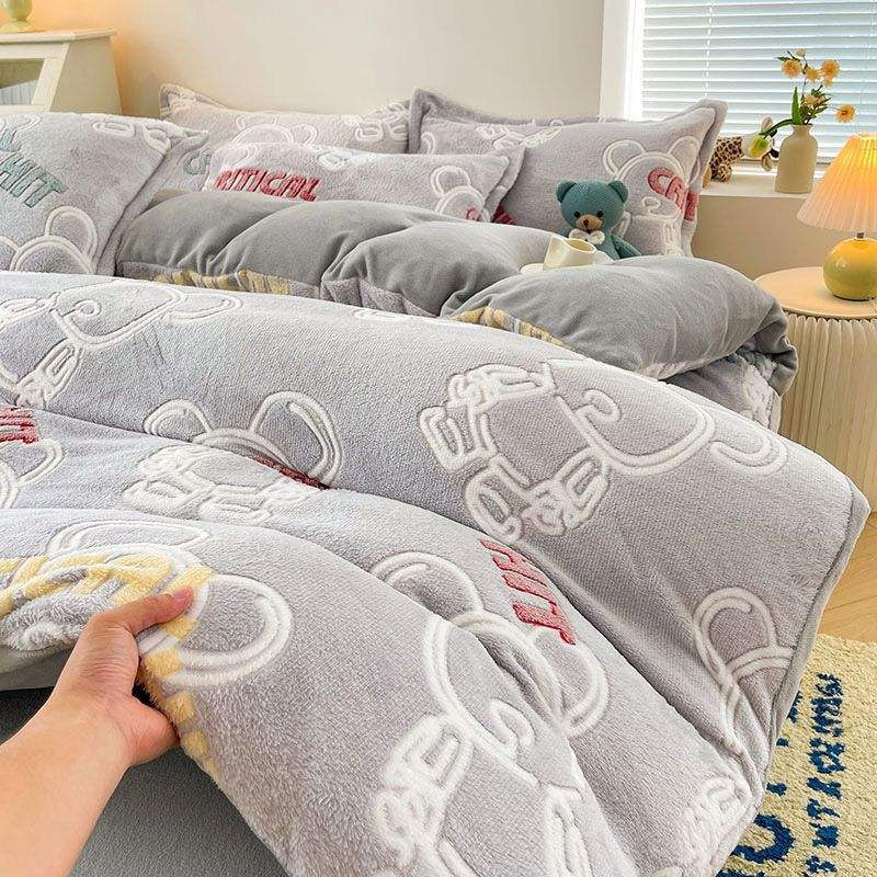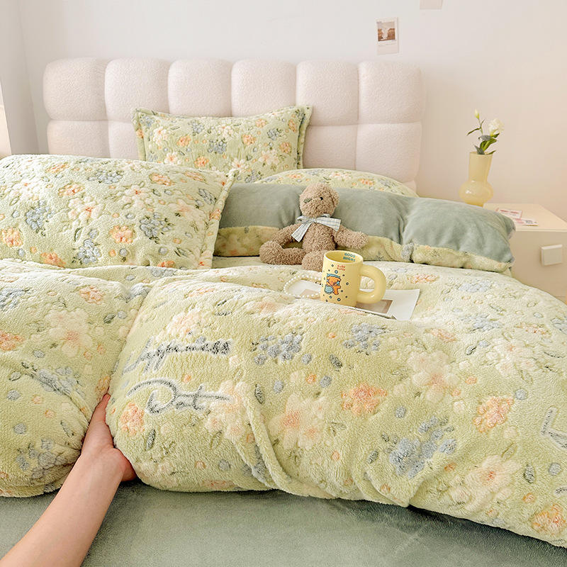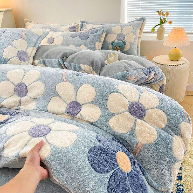 Set Quattro Pezzi in Pile Corallo Invernale Caldo Copripiumino in Pile Doppio Lato Lenzuolo in Flanella Fodera in Pile Morbido Ispessito