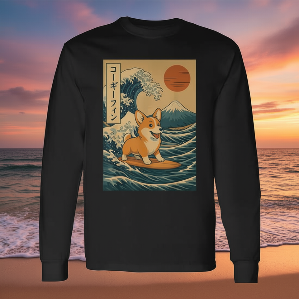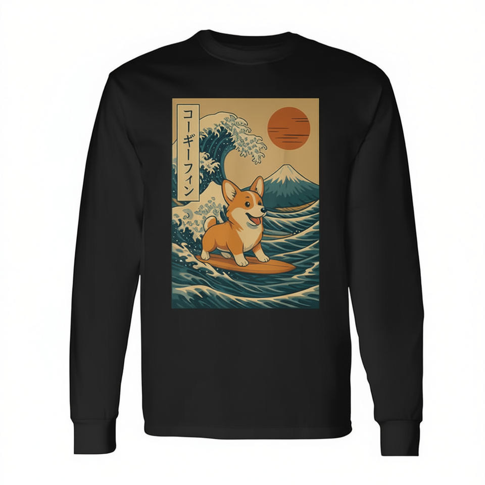 T-shirt a maniche lunghe Corgi Surfing Japanese Wave unisex per adulti taglia M L XL XXL