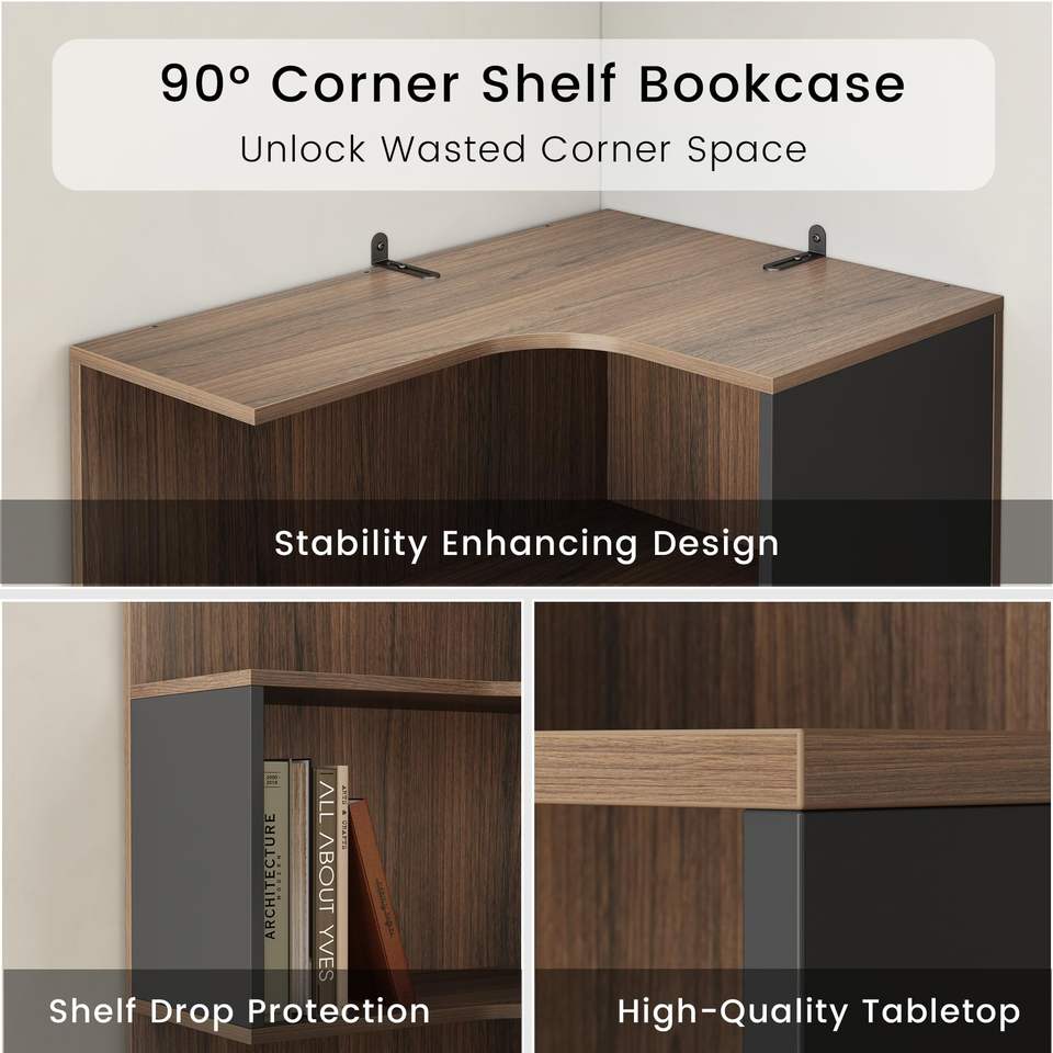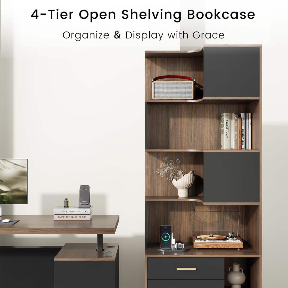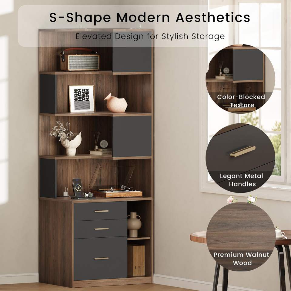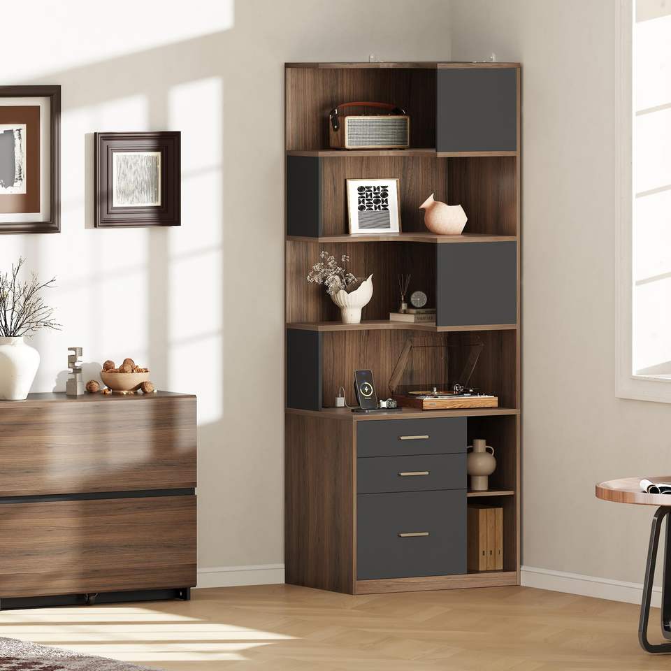 Libreria Angolare a L in Legno di Noce, Scaffale Geometrico Asimmetrico Alto con 3 Cassetti, Vetrina per Ufficio e Casa