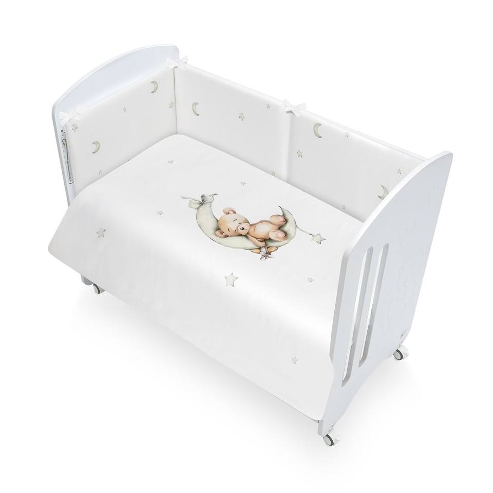 Cot Bed with Lovely Green Mod. Oso Luna-Estrella Design Coordinated with Removable Duvet Cover and 2pcs.