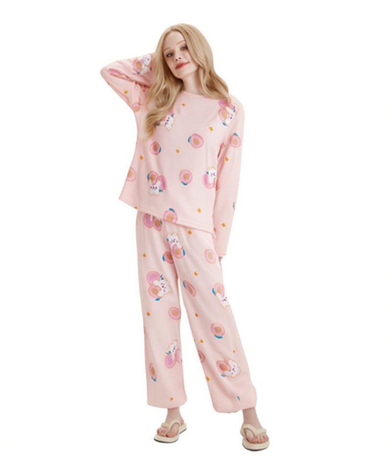Cotton Bamboo Women's Pajamas Long Sleeve Full Length Cartoon Print Soft Knitted Sleepwear Casual Autumn Round Neck Elastic