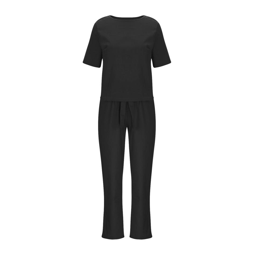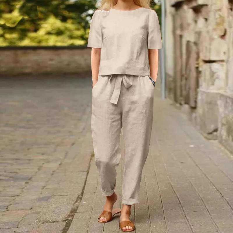 Set Estivo Retrò da Donna con Blusa Oversize a Mezza Manica in Cotone e Lino con Colletto a O e Pantaloni a Gamba Larga