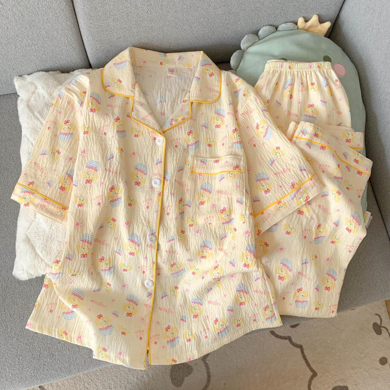 Cotton Summer New Pajamas for Women Sweet Cartoon Short Sleeved Shorts Long Pants Three Piece for Home Wear Women's Outerwear