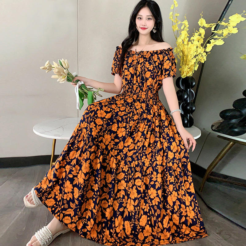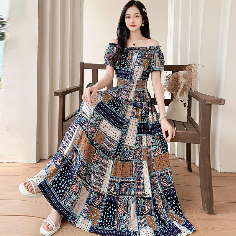 Cotton and Rayon Chiffon Floral One-shoulder Summer Ethnic Style Elastic Waist Beach Dress African Casual Bohemian Long Dress