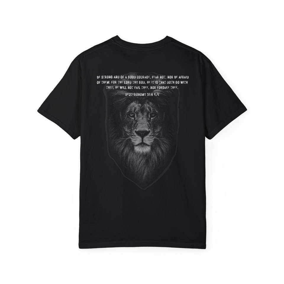 T-shirt unisex Courage & Faith tinta in capo, taglie forti, con croce e corona di spine ispirata a Deuteroisimo. 31:6