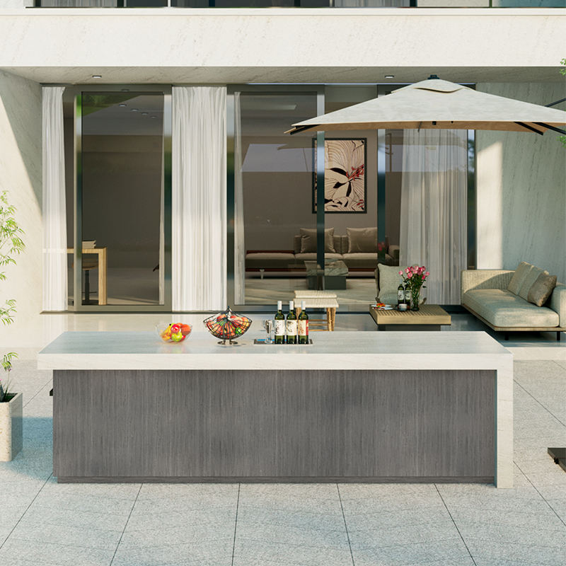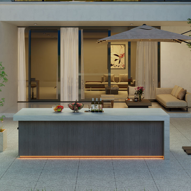 Piano cottura in granito: Il piano cottura in granito offre una superficie duratura e resistente agli graffi, ideale per l'uso all'aperto.