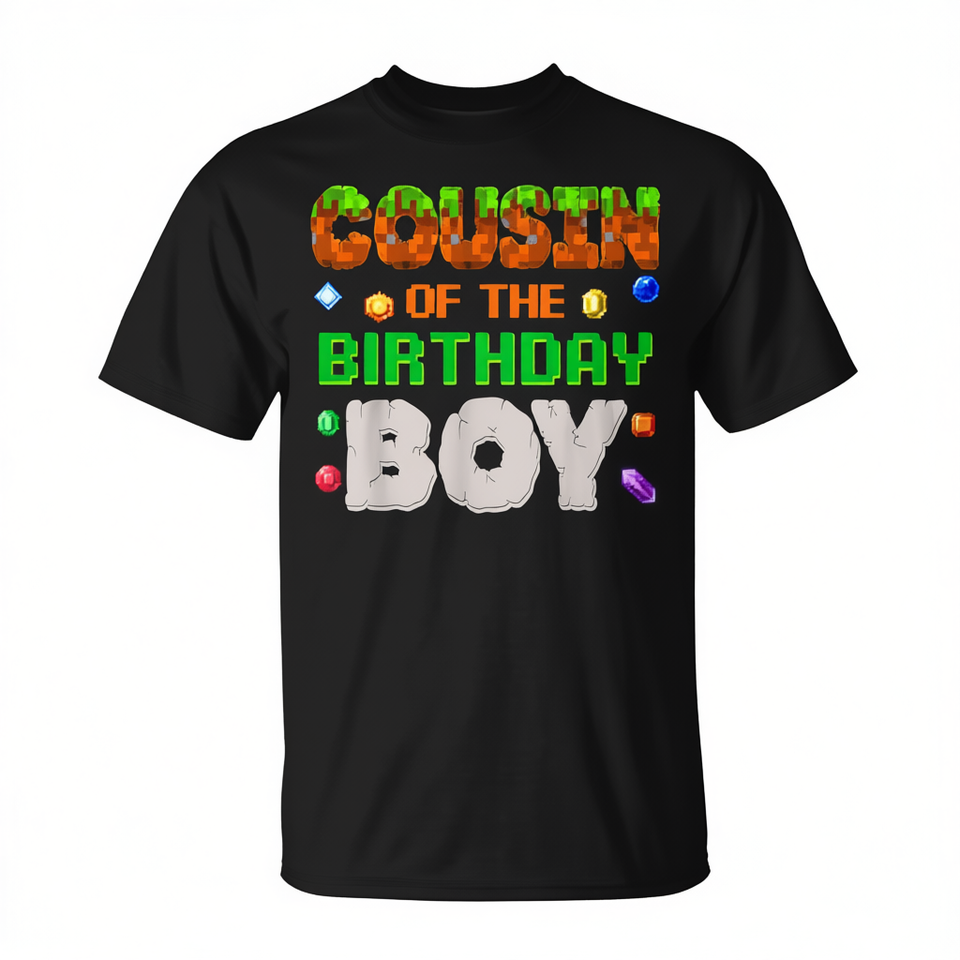 T-shirt Cousin Of The Birthday Boy Pixel nera, stile videogamer per ragazzi