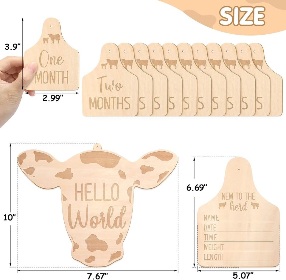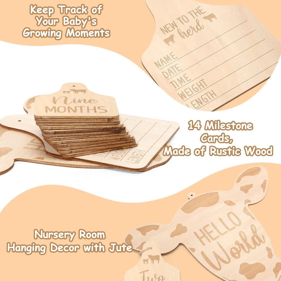 Carte Reversibili in Legno Rustico Incise con Tema Mucca per Fotografia di Neonati, Gravidanza e Baby Shower
