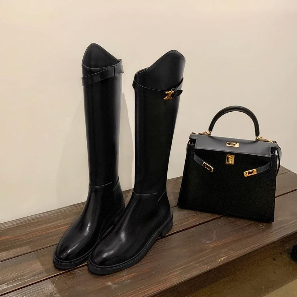 Cowhide Genuine Leather British Style Women's Autumn Winter High Chunky Heel Long Boots with Back Zipper and Sheepskin Lined