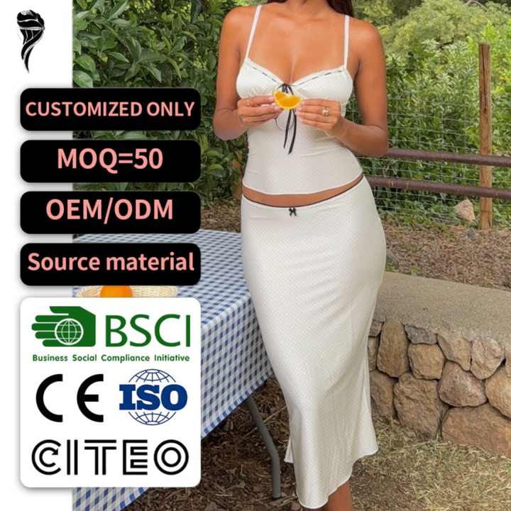 Completo due pezzi a pois neri da donna: top a canotta con bordo in pizzo e gonna midi in raso con dettaglio fiocco