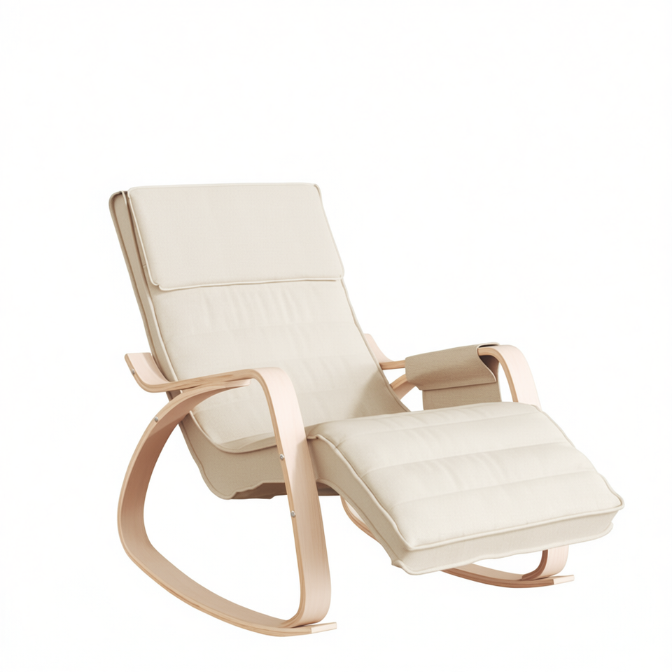 Sedia a dondolo color crema con gambe in legno, design moderno scandinavo per l'arredamento del soggiorno