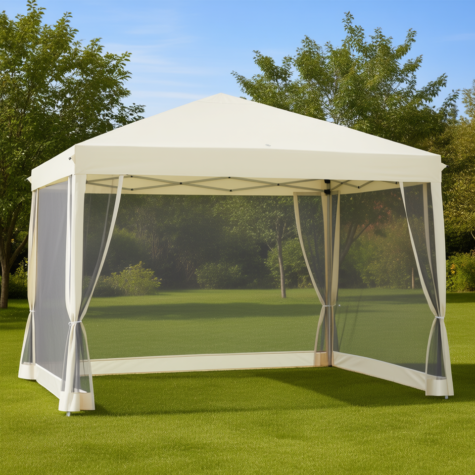 Tenda Pop-Up Bianco Crema 10x10 con Pareti Laterali in Rete, Montaggio Istantaneo per Eventi all'Aperto e Uso in Patio