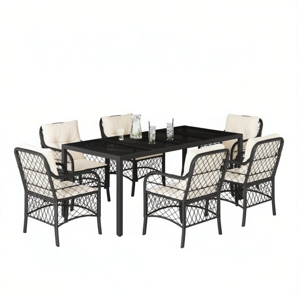 Cream White Black Garden Dining Set 6 Seater Rattan Metal Frame Weather Resistant Outdoor Furniture Contemporary Design
