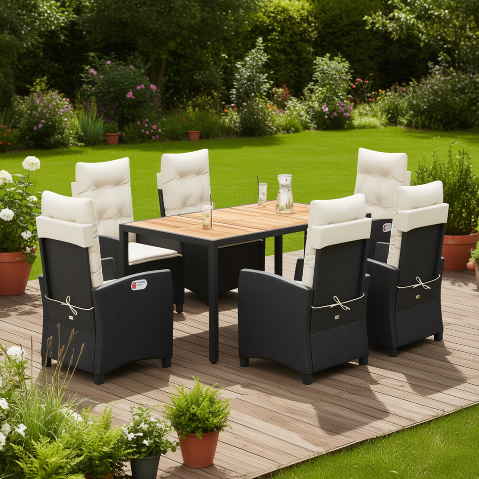 Set da Pranzo da Giardino in Rattan Bianco Crema e Nero, 6 Posti, Arredamento da Esterno Resistente alle Intemperie, Design Contemporaneo