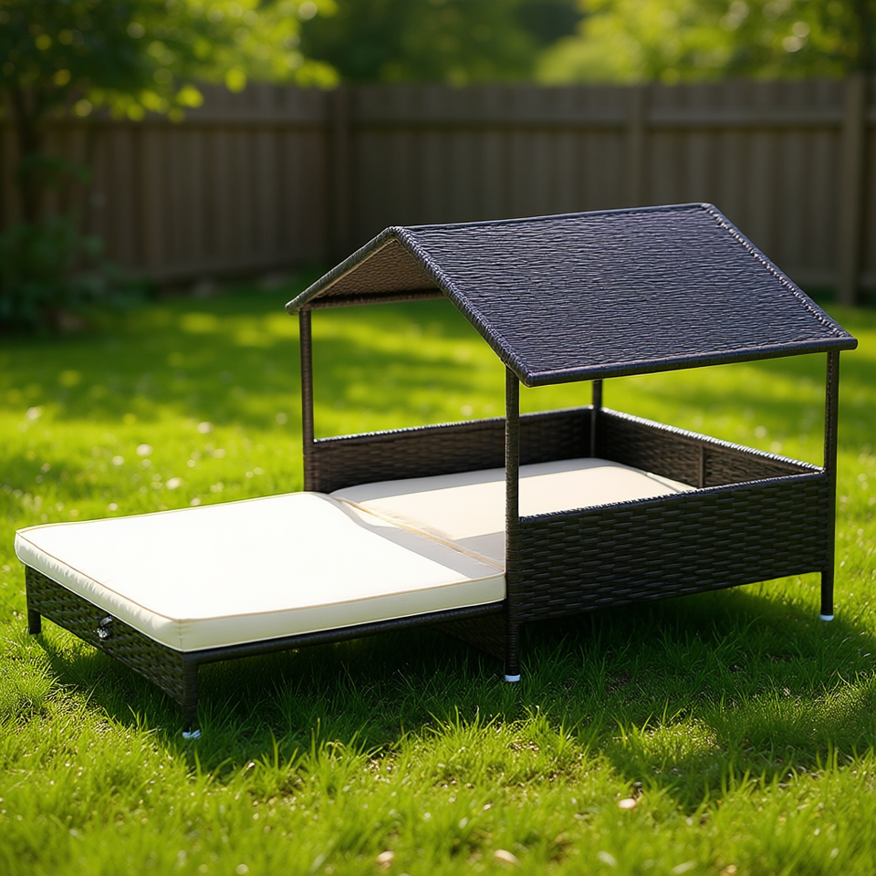 Cuccia estensibile in vimini per cani da esterno con tetto impermeabile e cuscino morbido per cani di taglia piccola e media