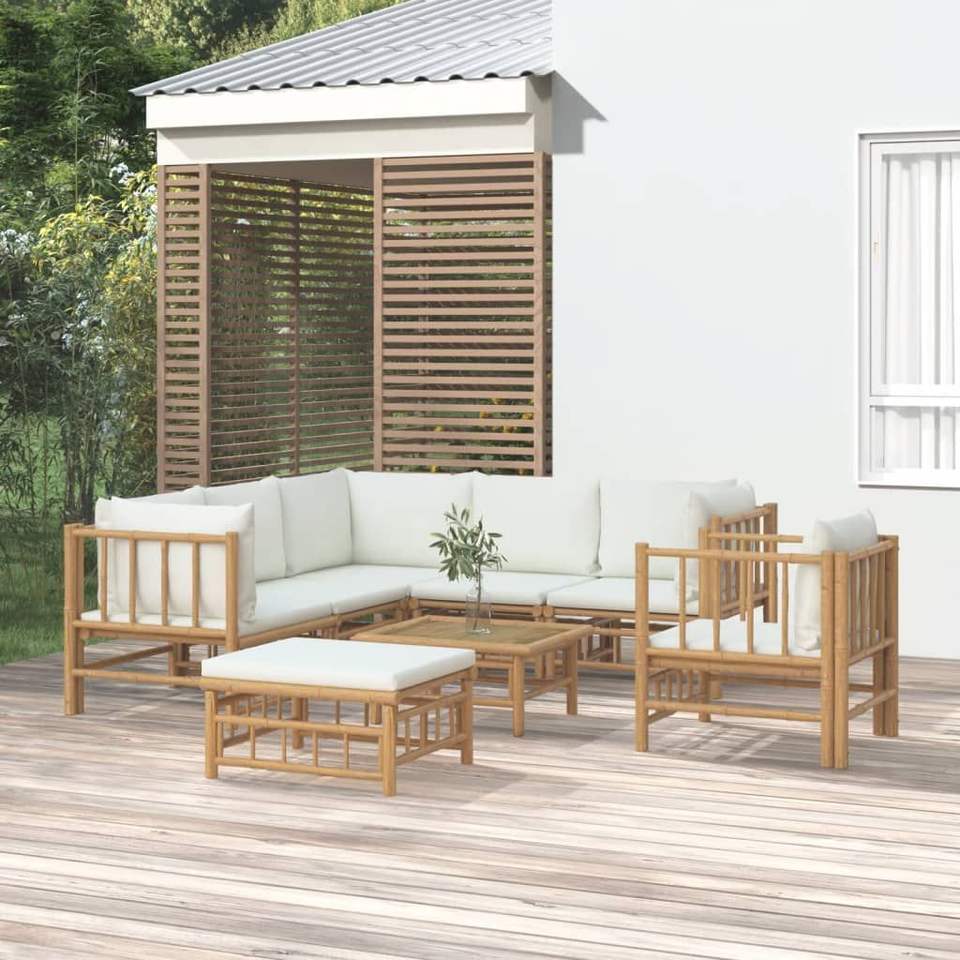 Set Lounge da Giardino Bianco Crema in Bambù Naturale, Arredamento da Esterno 6 Posti Stile Asiatico