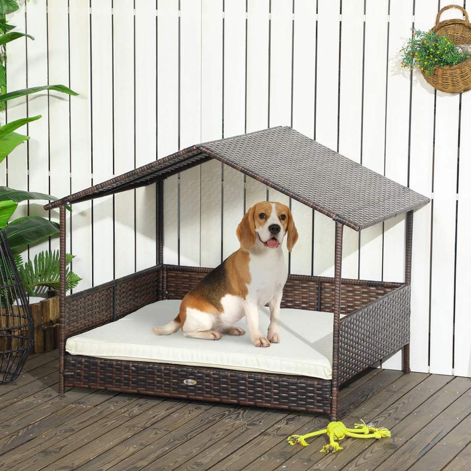 Cane per cani da esterno in Rattan bianco crema con copertura rimovibile morbido cuscino a baldacchino per cani medio-grandi