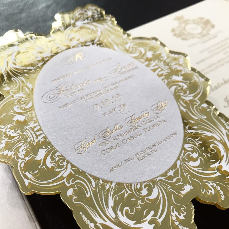 Invito stravagante dello specchio acrilico dell'oro di disegno creativo con il Menu acrilico di nozze o di velluto