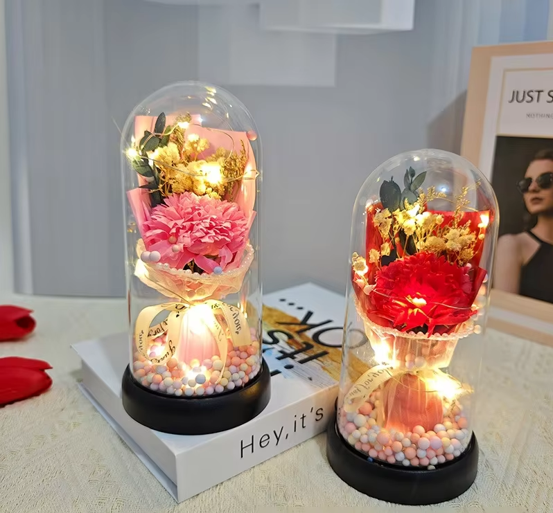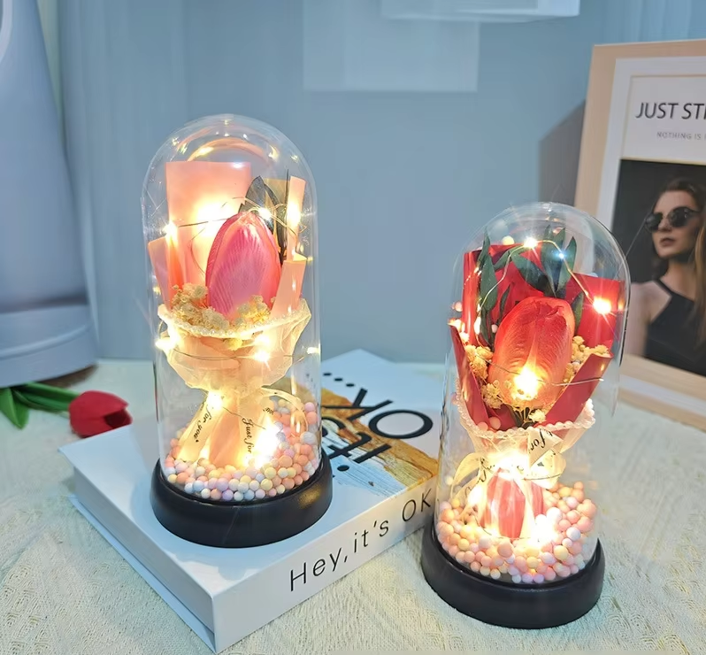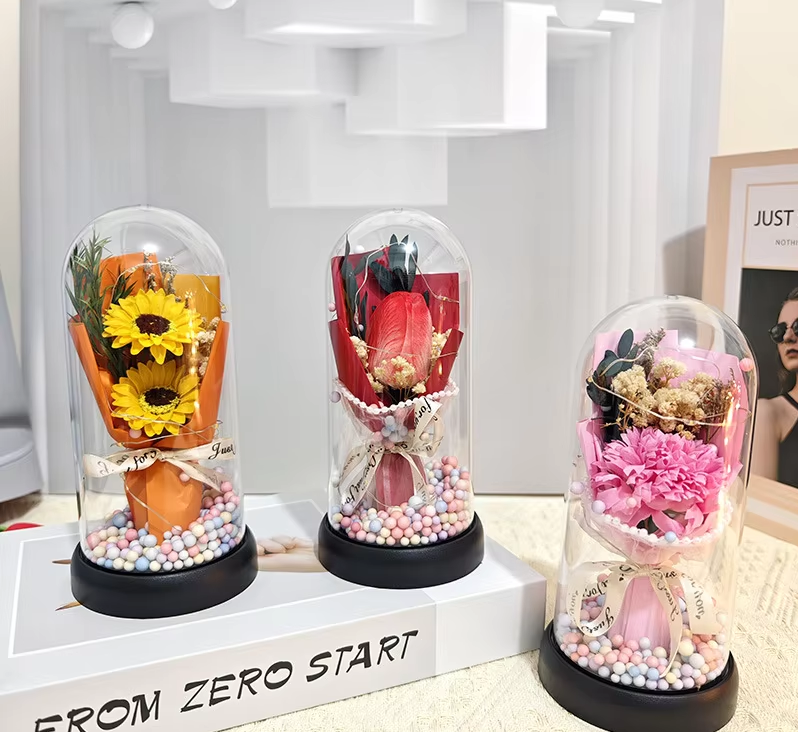 Creative Glass Cover Ornament with Artificial Roses Carnations Tulips 'Eternal Flower' Finished Soap Artistic Floral Design