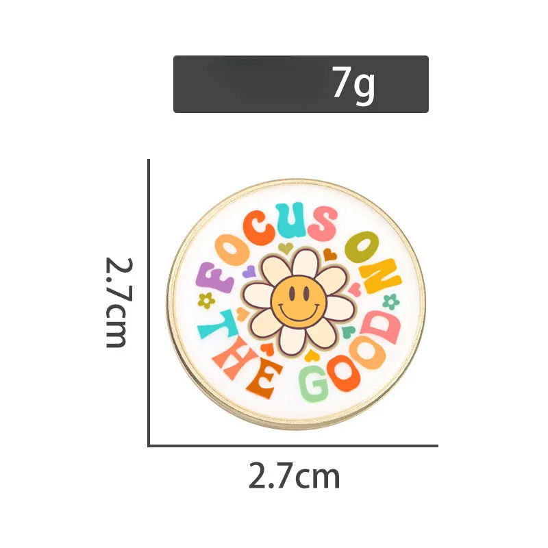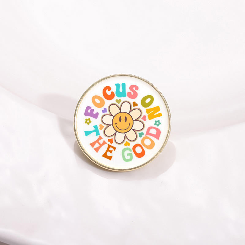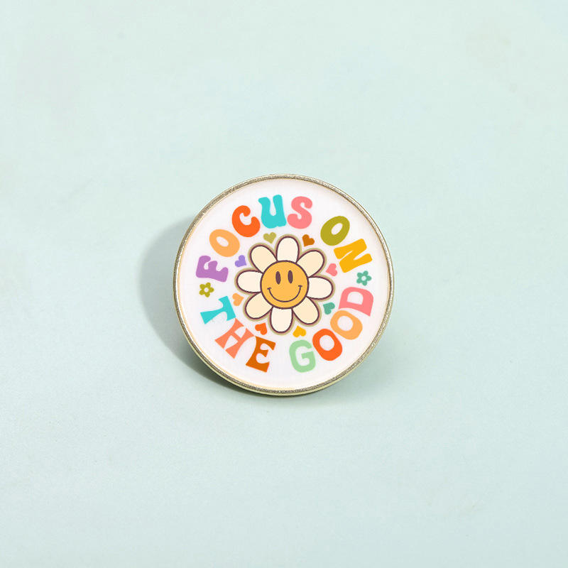 Spilla smaltata creativa con citazione positiva "Focus on the Good" e faccina sorridente floreale, per decorazione di zaini, cappelli e abbigliamento