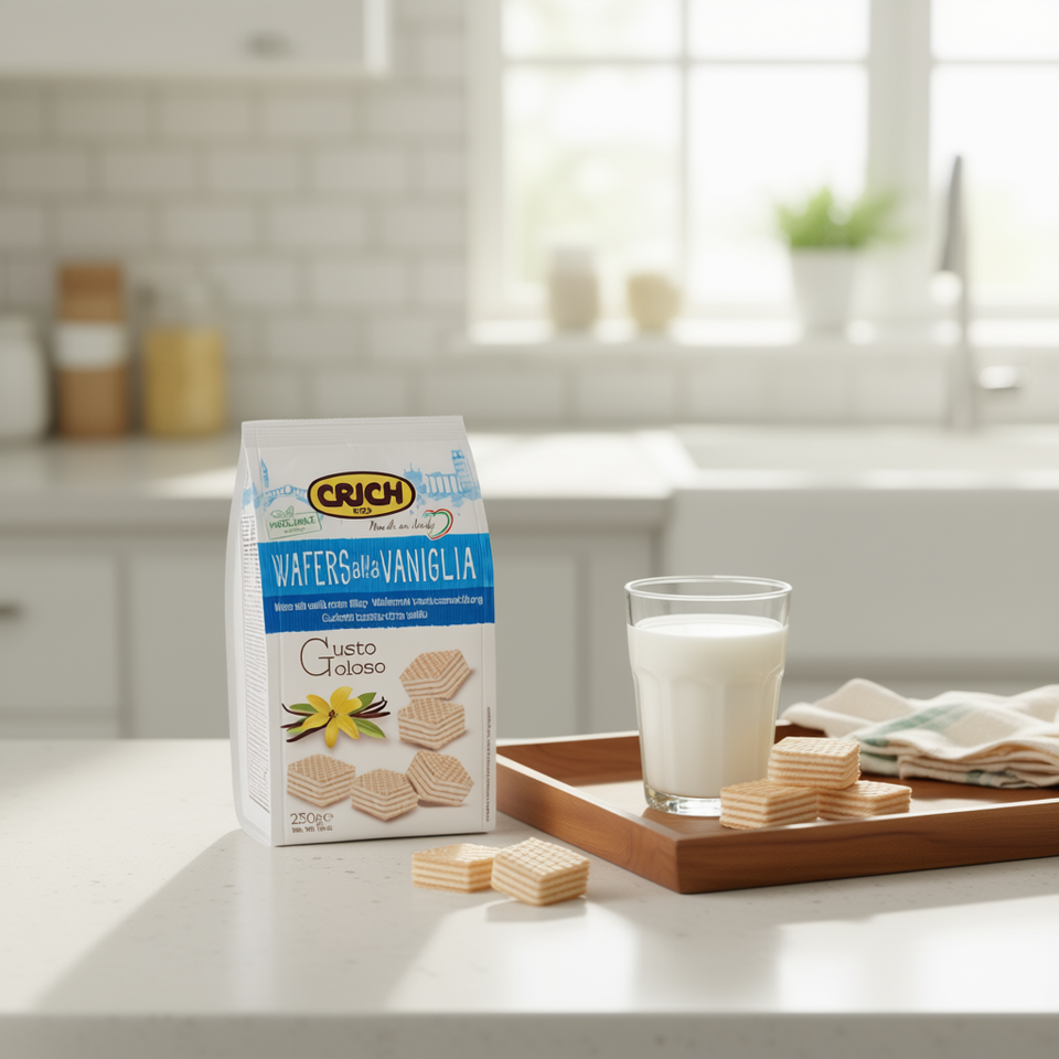 Wafer Quadrati Croccanti alla Vaniglia Fermentati con Crema Dolce Crich 250g in Confezione Biscotti Premium