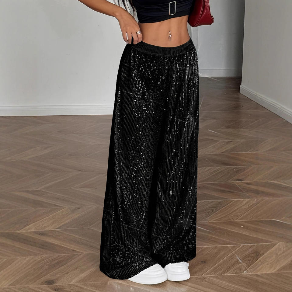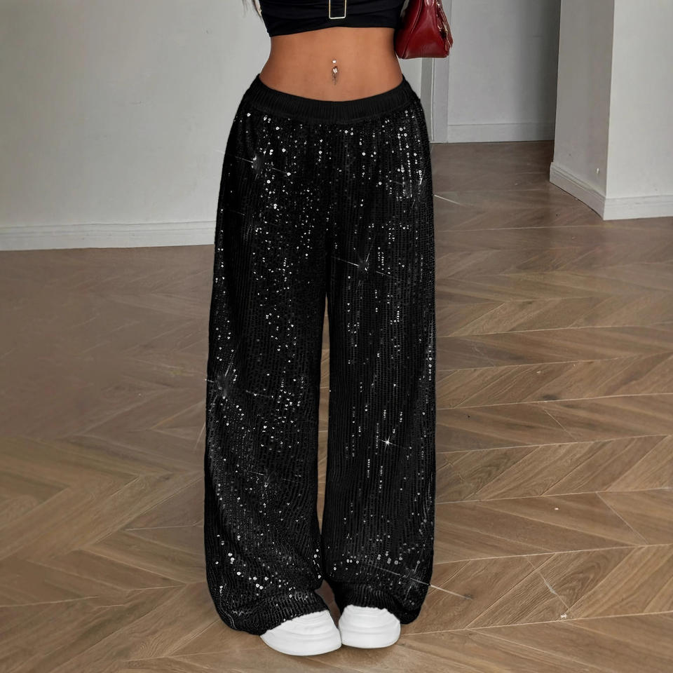 Pantaloni Eleganti da Donna Taglia Europea e Americana, a Vita Alta, con Paillettes, Gamba Svasata, Casual, Lunghi, Neri, alla Moda, 100%