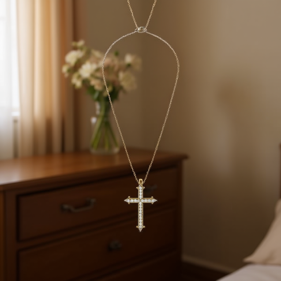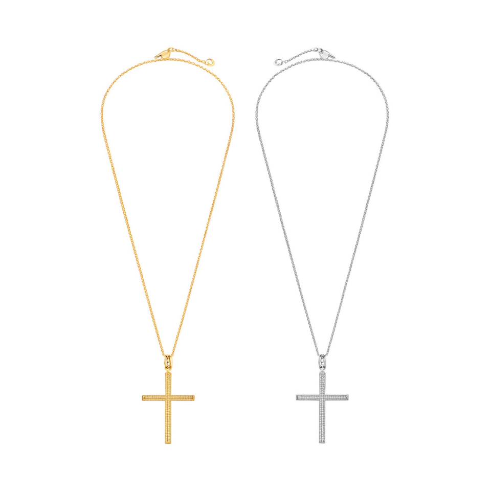 Collana con Ciondolo a Croce 10x15Cm con Diamanti, Tono Argento e Oro, Acciaio