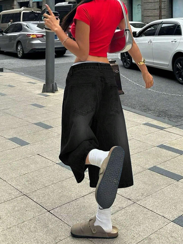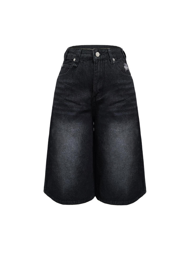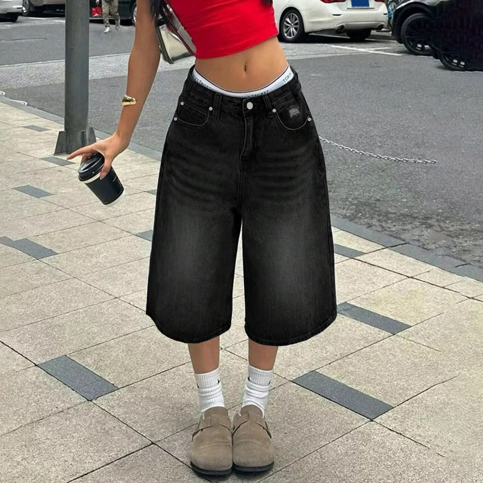 Commercio estero transfrontaliero pantaloni corti americani in Denim retrò per donna pantaloni alla moda strappati neri a gamba larga di media lunghezza