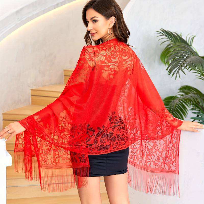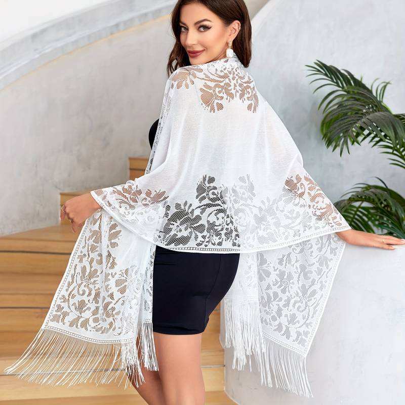 Nuovo Sciarpa/Stola Lunga in Garza con Nappe e Pizzo a Tinta Unita in Lana, Stile Musulmano Malese, per Donna - Collezione Estiva Transfrontaliera