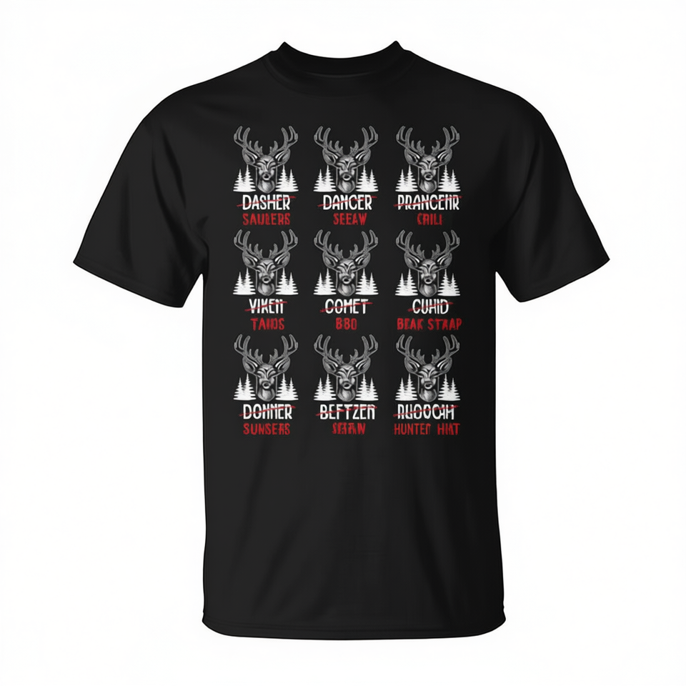 T-Shirt con Nomi di Renne Cancellati, Scherzo per Cacciatori di Cervi, Prodotto Promozionale