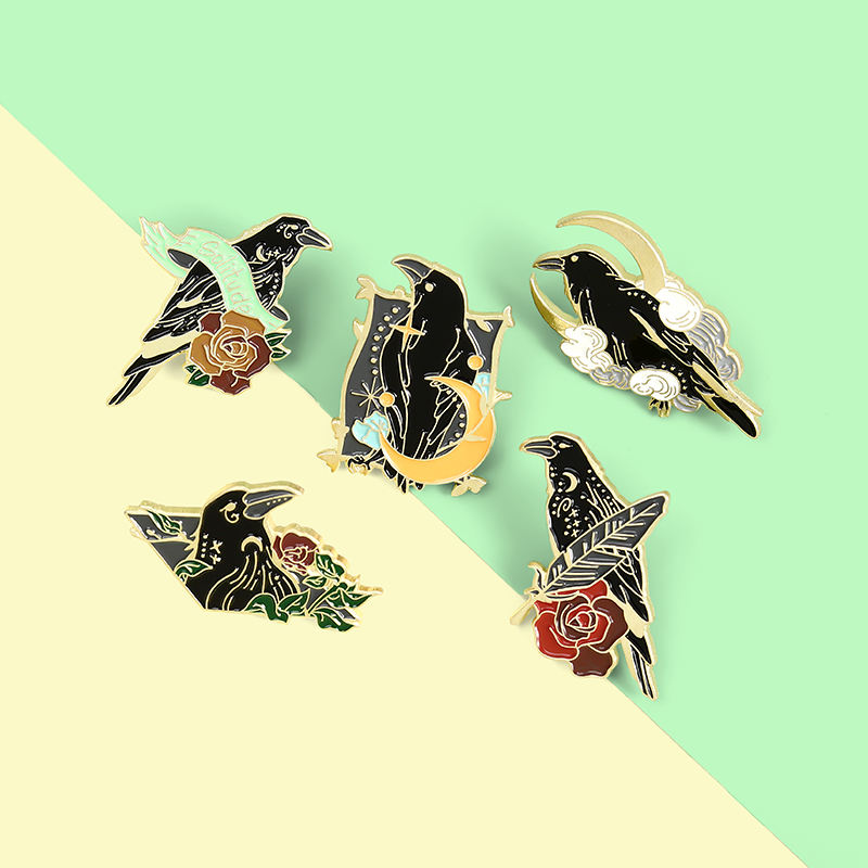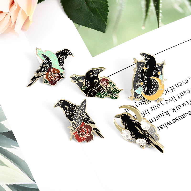 Spille e Spille a Spillo in Smalto Duro Placcato con Corvo, Piuma di Uccello, Luna e Fiori, Personalizzate, per Borsa, Distintivi Punk e Metallo Gotico
