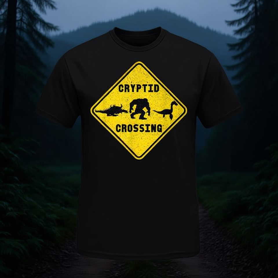 T-shirt Cryptid Crossing con design di segnali stradali gialli, stampa grafica Bigfoot Nessie Hodag, taglia unisex per adulti