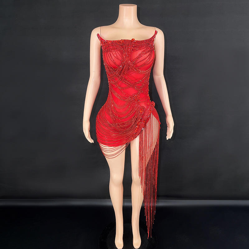 Crystal Party Dresses Women Beaded Tassel Chain Short Mesh Women's Clothing Fall 2023 Elegant Women Evening Dress Red