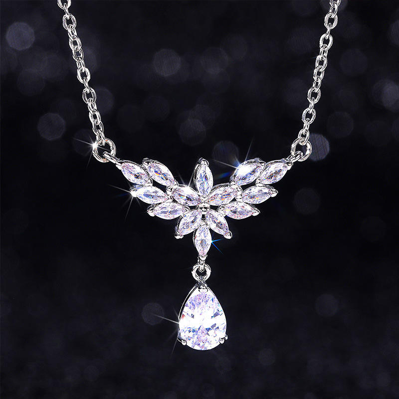 Collana con ciondolo in cristallo, design floreale placcato in rodio argento, ciondolo a goccia, gioielli da sposa per donna