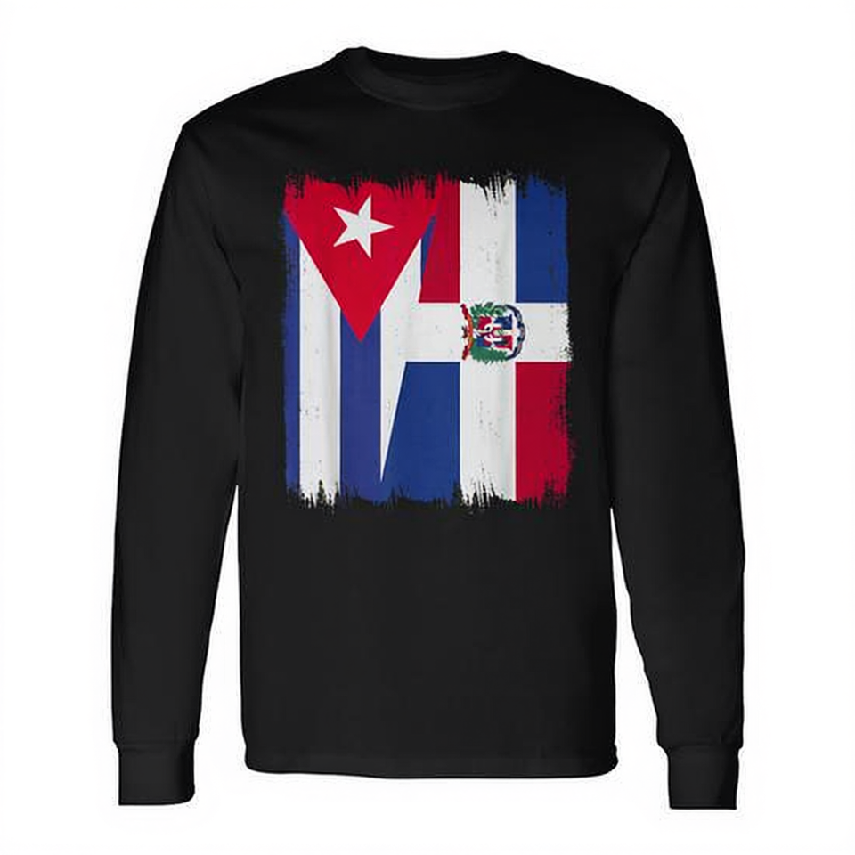 T-Shirt a Maniche Lunghe con Mezza Bandiera di Cuba e Repubblica Dominicana, Maglietta Promozionale Cubana Dominicana