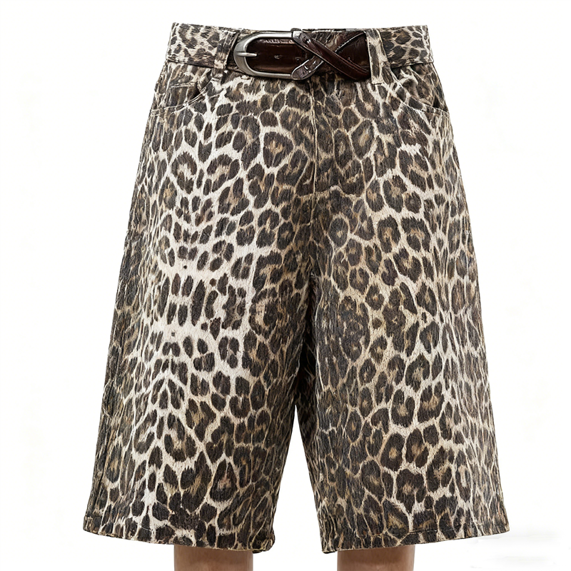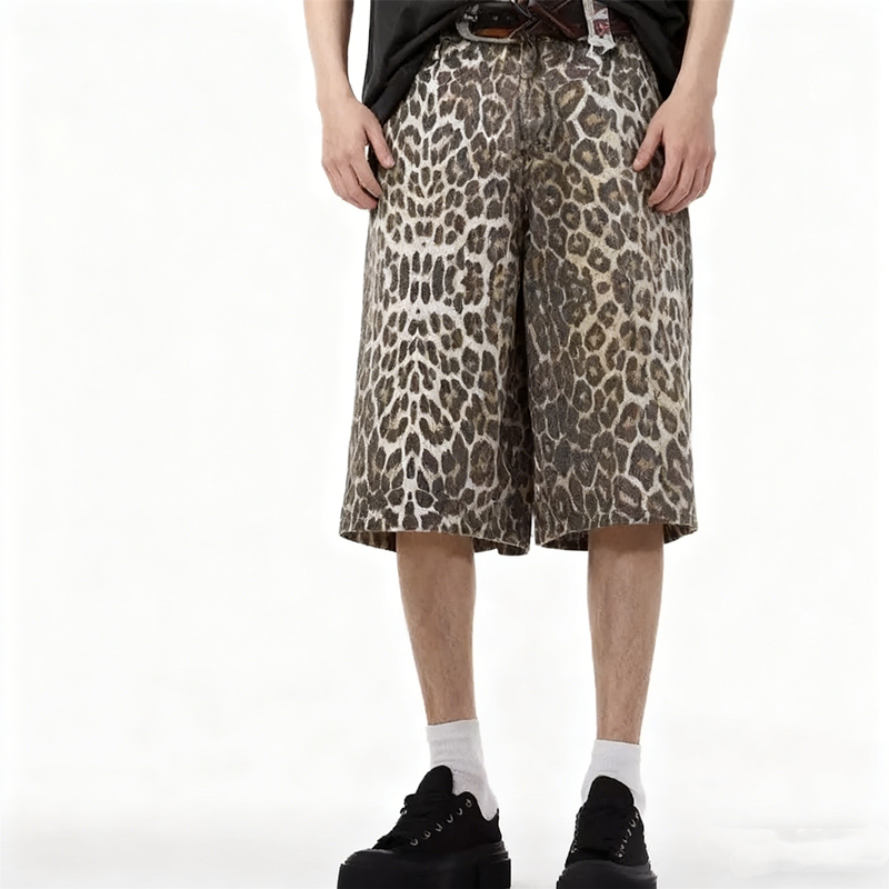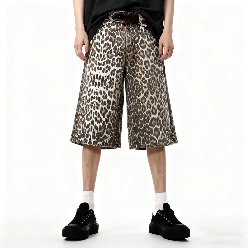 Set di Culottes in Jeans e Pantaloncini in Denim da Uomo con Stampa Leopardata a Vita Alta o Design Personalizzato