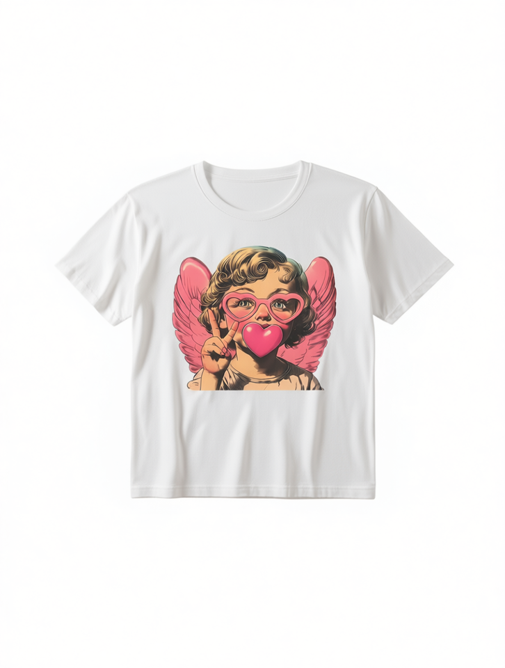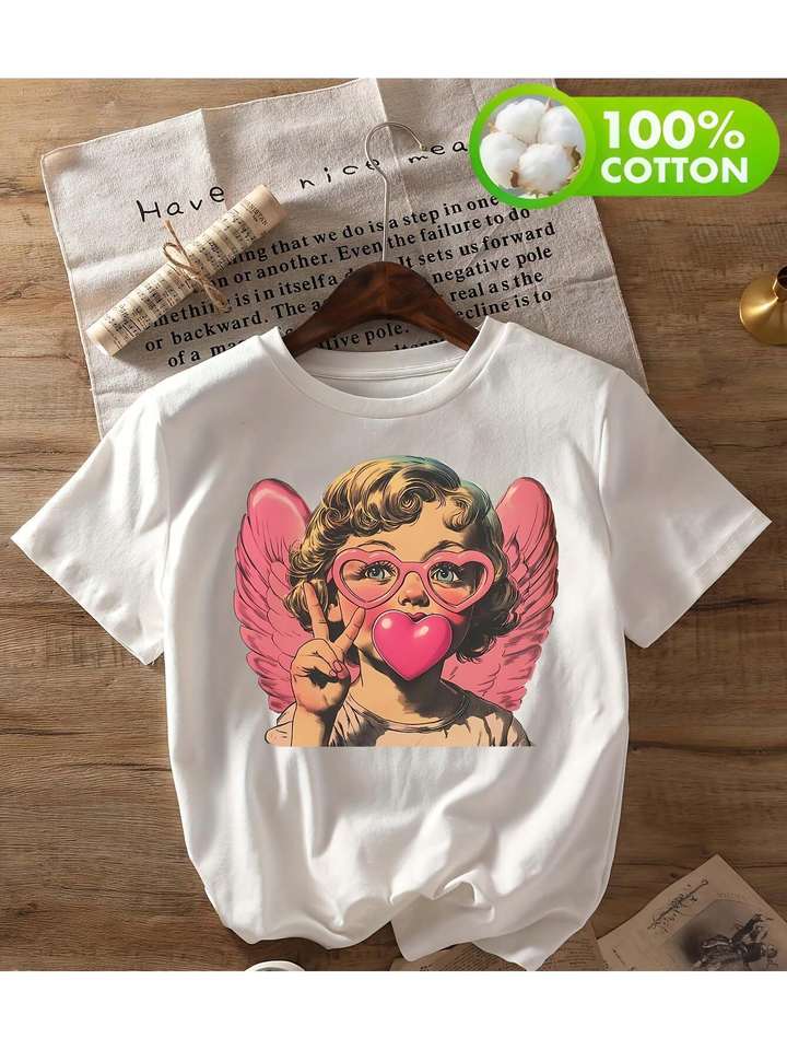 Cupid Graphic Print T-Shirt Women Short Sleeve Round Neck White Casual Summer Top Machine Washable Comfortable Jersey Fabric