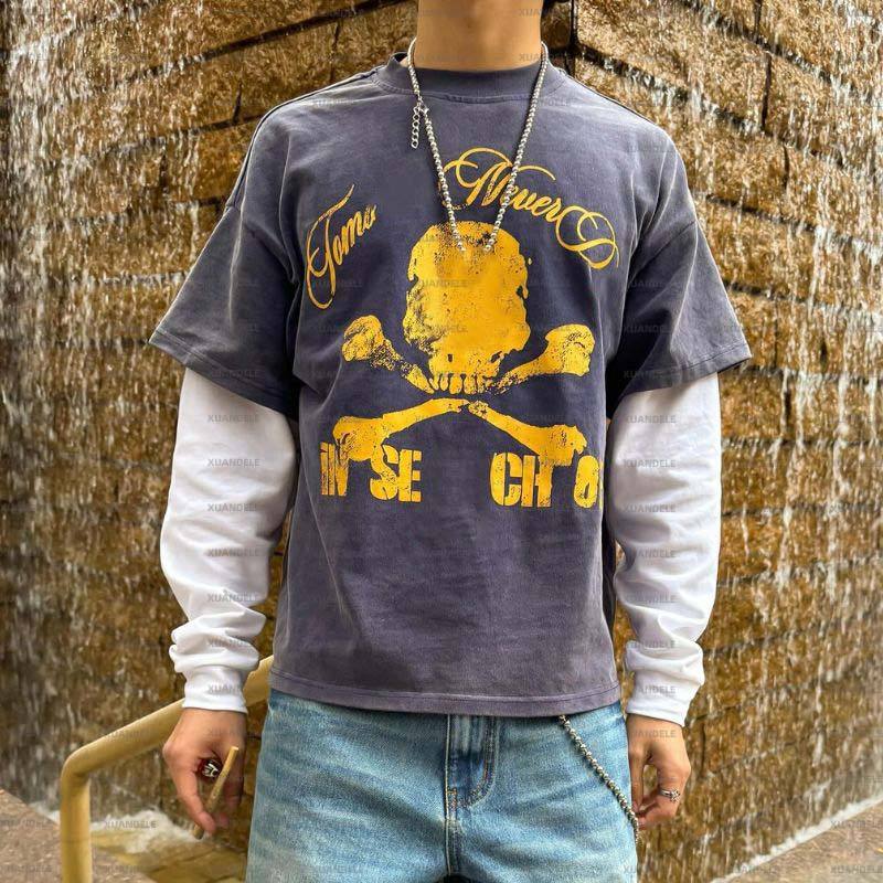 T-Shirt Personalizzata 100% Cotone a Doppio Strato con Lavaggio Acido, Grafica Teschio Stampata, Maglietta a Maniche Lunghe a Doppio Strato per Uomo